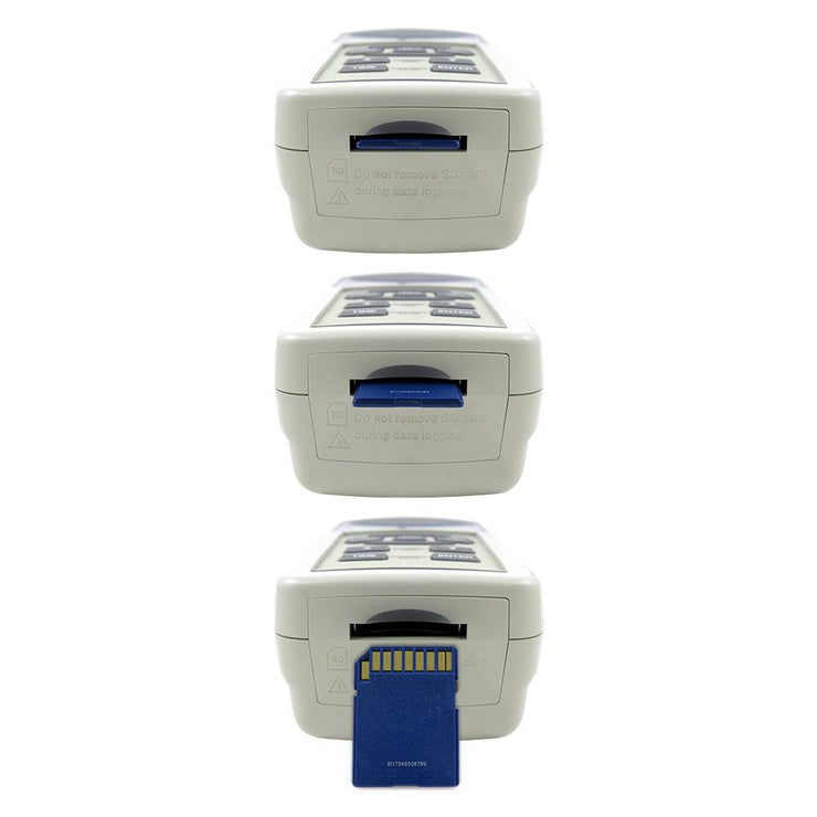 Una nueva función avanzada compensa la diferencia de luz de tungsteno, fluorescente, mercurio y luz diurna, lo que garantiza lecturas de alta precisión bajo diversas fuentes de luz. Registra datos en tarjetas de memoria SD estándar (como las de una cámara digital). Cuando la tarjeta esté llena, simplemente cámbiela para obtener almacenamiento ilimitado. La tarjeta SD extraíble es fácil de transportar e insertar en la ranura para tarjetas de memoria de un ordenador o en un lector de tarjetas SD. Carga datos preformateados a Excel sin necesidad de software ni cables adicionales. Hay tarjetas SD adicionales disponibles en una variedad de tamaños de memoria. Cada conjunto de datos incluye lecturas en lux o pies-candela, hora y fecha.